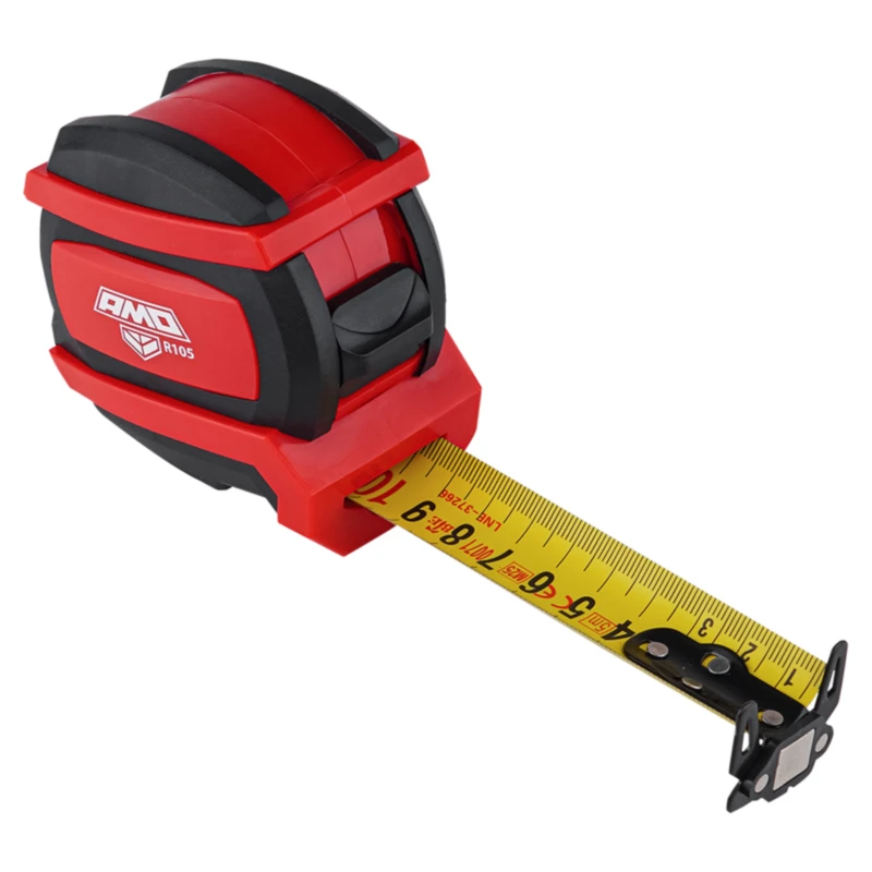 Мерная лента шириной 32 мм, изготовленная из неподверженной растяжению углеродистой стали, обладает достаточной жесткостью в рабочем положении. За счет вогнутой формы, она не заламывается при значительном вылете. Благодаря этому поддерживается прямолинейность полотна с миллиметровой разметкой, что не только облегчает обмеры, выполняемые в одиночку, но и позволяет производить с помощью рулетки AMO R105 простые разметочные работы, как обычной линейкой. Для упрощения закрепления края ленты за внешние грани предметов, находящихся на большом удалении от пользователя, торцевая часть измерителя снабжена двусторонним усиленным зацепом увеличенного размера. Возможность фиксации нулевой точки отсчета рулетки на стальных конструкционных элементах обеспечивают плоские неодимовые магниты.