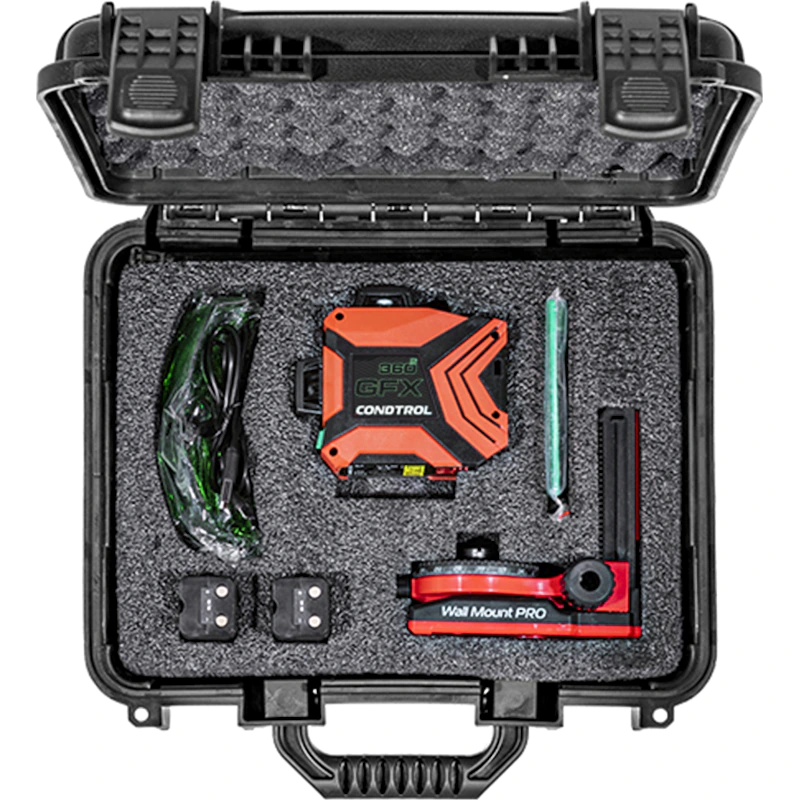 CONDTROL GFX 360-2 Kit. Это профессиональный расширенный комплект, включающий в себя лазерный нивелир GFX 360-2, настенное крепление Wall Mount pro, очки, магнитную мишень, кабельную стяжку, аккумулятор, кабель для зарядки, адаптер для батареек, руководство по эксплуатации и надежный пластиковый кейс.