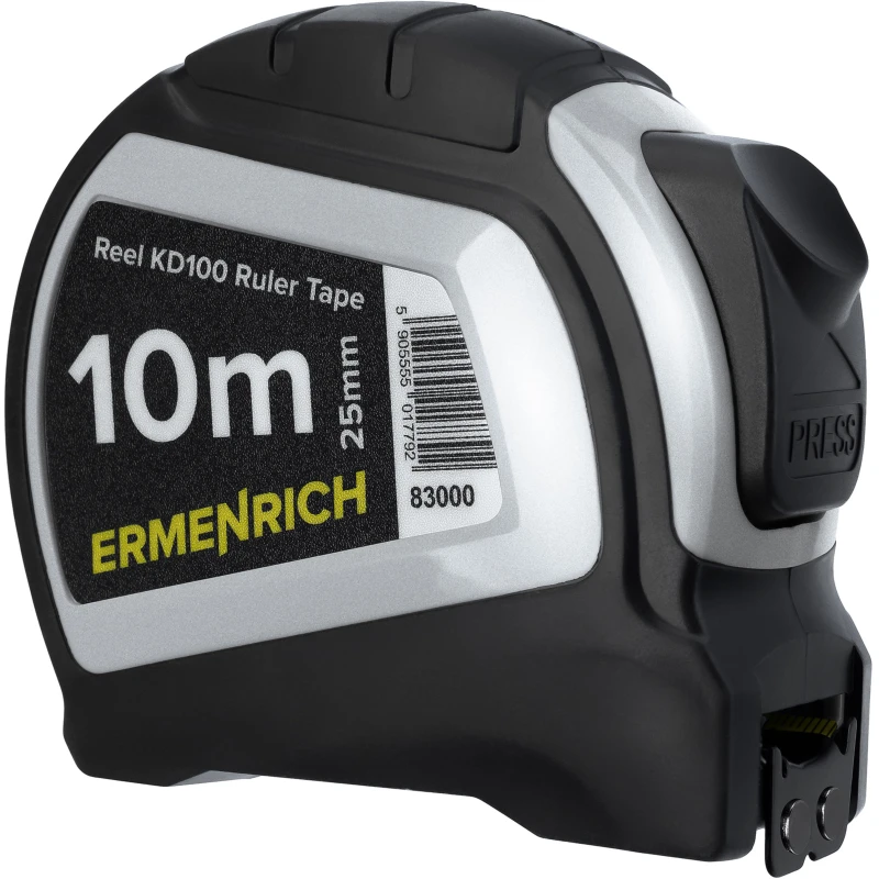 Рулетка Ermenrich Reel KD100 поможет провести линейные замеры при работе с окнами, дверными проемами, интерьером и мебелью, строительными материалами и так далее. Длина ее полотна с односторонней шкалой достигает 10 м, оно выполнено из прочной матовой стали. Конец мерной ленты оснащен намагниченным зацепом. Одним словом, это классическая механическая рулетка.