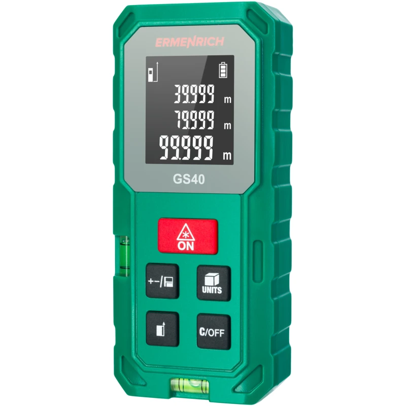 Лазерная рулетка Ermenrich Reel PLUS GS40 обладает несколькими функциями: измеряет линейные длины, рассчитывает площади и объемы пространства. Она может проводить измерения от точки до точки, суммировать показания измерений между несколькими точками или непрерывно «сканировать» пространство. Можно выбрать единицы измерения: доступны метры, дюймы и футы. Сохранить результат (максимум 20 групп) можно во внутренней памяти.