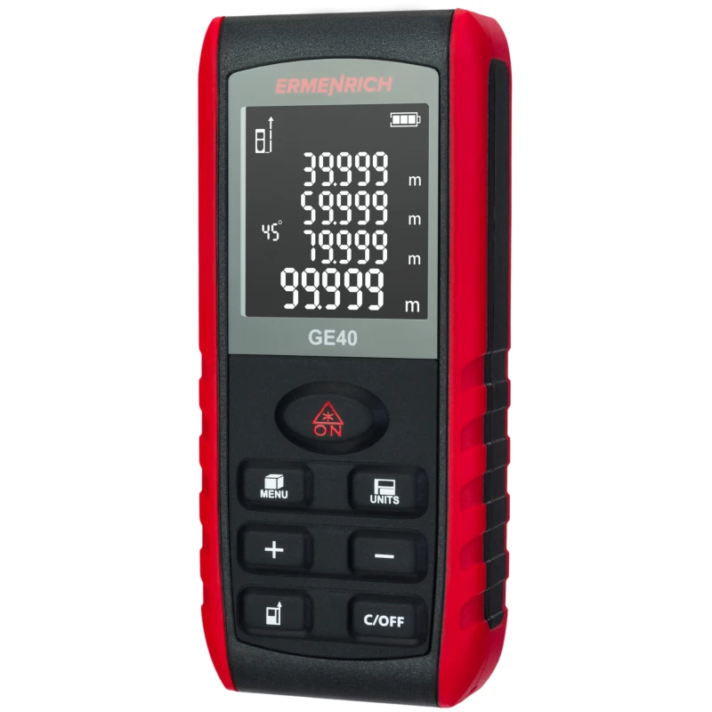 Рулетка Ermenrich Reel PRO GE40 на основе лазера пригодится не только для измерения прямых отрезков, но и для оценки углов, площади поверхности или объема объекта. Это небольшой прибор в пластиковом корпусе с монохромным контрастным экраном на 4 строки. Рулетка производит лазерный луч I класса безопасности.