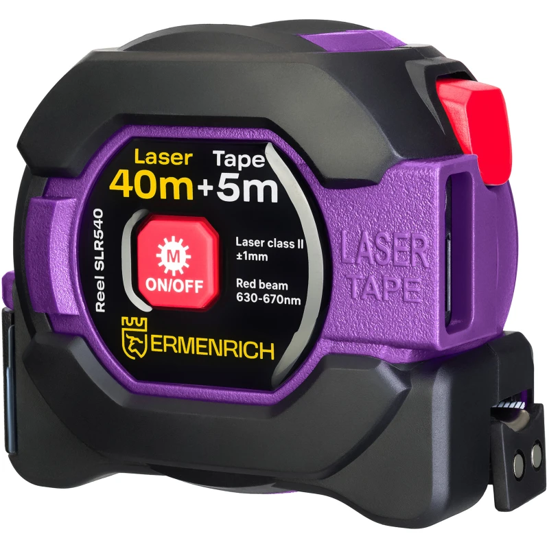 Ermenrich Reel SLR540 совмещает в себе ленточную рулетку и лазерную, что пригодится в множестве работ, требующих точных замеров. Рабочая дальность красного лазера достигает 40 м, минимальное расстояние до предмета – от 20 см. При этом погрешность луча не превышает 3 миллиметров.