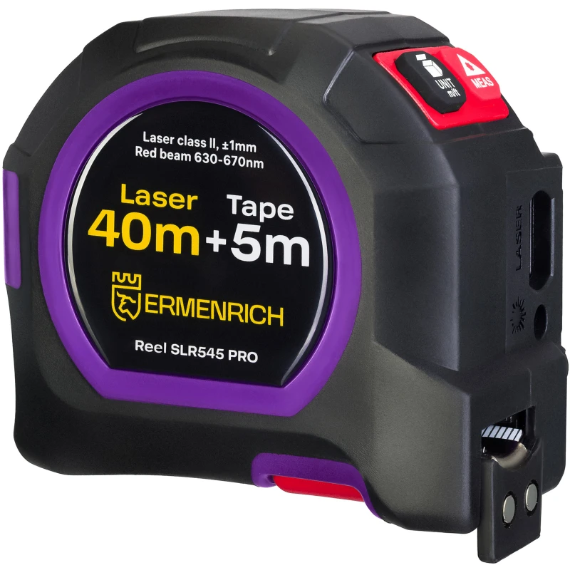 Модель Ermenrich Reel SLR545 PRO объединяет обычную механическую рулетку с мерной лентой и лазерный дальномер. Два прибора в одном позволяют измерять не только линейную длину, но и площади и объемы. Длина лазерного луча достигает 40 метров – замеры доступны до этого расстояния. Минимальный размер длины объекта – 20 см. В дальномере можно выбрать единицы измерения: метры, футы или дюймы. Погрешность измерений составляет 0,001 м. Прибор работает от встроенного аккумулятора и заряжается с помощью подключения через USB-кабель. Для экономии заряда дальномер самостоятельно отключается через 30 секунд.