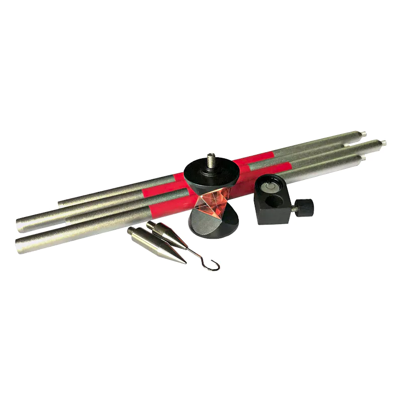 Комплектная разборная минивеха позволяет установить призму в широком диапазоне высот. В набор также входит крюк для подвешивания и пузырьковый уровень, который можно закрепить на вехе для контроля положения.