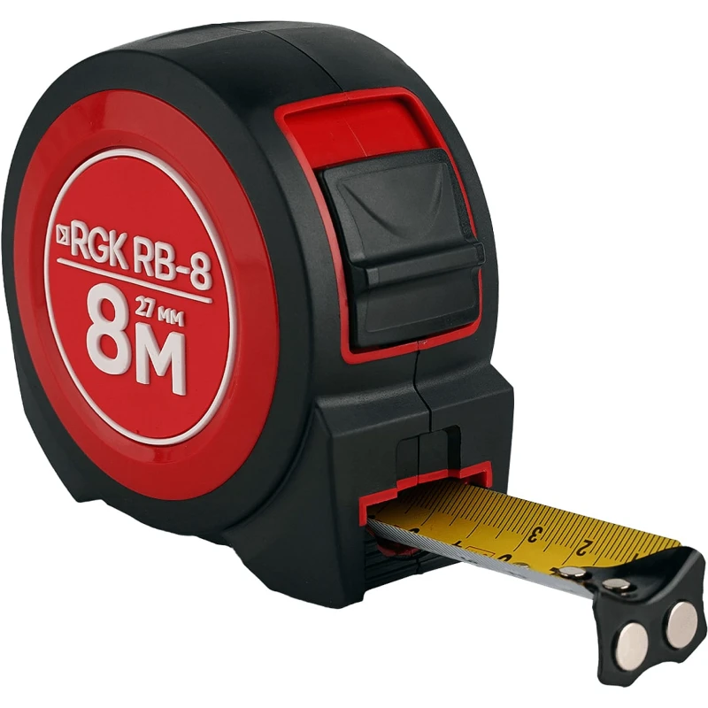 Измерительная рулетка RGK RB-8 представляет собой компактный инструмент для контроля размеров, определения дистанций и разметки методом прямых измерений по шкале 8-метровой ленты, которая в нерабочем положении сворачивается в закрытый пластиковый корпус под действием пружинного механизма. В качестве материала мерного полотна используется углеродистая сталь, не подверженная растяжению при физических нагрузках, благодаря чему изделие сохраняет свои метрологические характеристики в течение всего срока эксплуатации, даже при интенсивном использовании. Широкая лента удерживает вогнутую форму при выдвижении из корпуса, поэтому мерное полотно не заламывается при значительном вылете, позволяя при обмере больших объектов обходиться без посторонней помощи.
