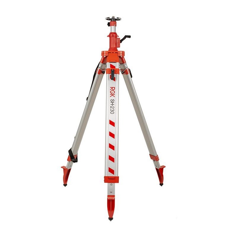 Эта модель одинаково хорошо подходит для применения в помещении и на улице. Ножки устройства снабжены прочными металлическими упорами для установки на грунт и резиновыми наконечниками, которые совместно с цепями предотвращают скольжение на гладких поверхностях. Раздвижной механизм стоек фиксируется в нужном положении специальными клипсами. Штатив для лазерного нивелира RGK SH-230 изготовлен из прочного алюминия, не подверженного коррозии.
